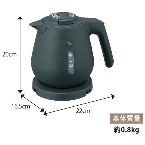 商品仕様 | ●容量/0.8L ●色/スレートブラック ●沸騰目安時間/カップ1杯:約60秒、満水:約4分 ●消費電力/1300W ●保温設定(最大)/なし ●寸法/W220×D165×H200mm ●質量/1000g ●その他仕様/●転倒湯漏れ防止構造 ●保証期間/1年 ●備考/※重量は電源プレートを含む |