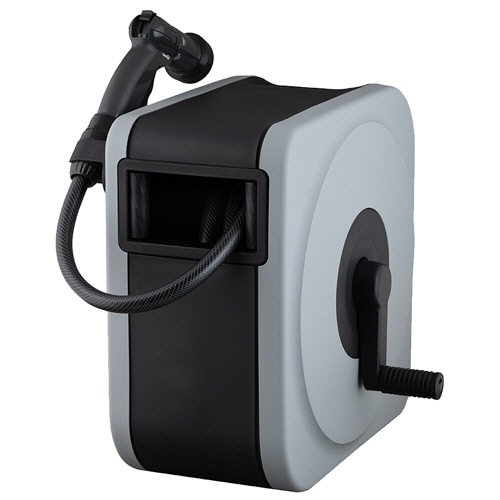 ●日差しからホースを守るカバー付きボックスタイプの散水ホースリール、グレーの本体・ホース長さは30mです。