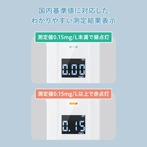 ●測定値が0.15mg/L未満の場合は緑色のライトが点灯し、酒気帯びとなる国内基準値の0.15mg/L 以上であれば赤色のライトが点灯します。