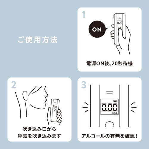 ●電源を入れ、約20秒の待機時間後に息を吹き込むだけで酒気帯びの有無を確認できます。数値とブザー、ライトで結果をお知らせし、測定結果を0.01mg/L単位、100段階で表示します。