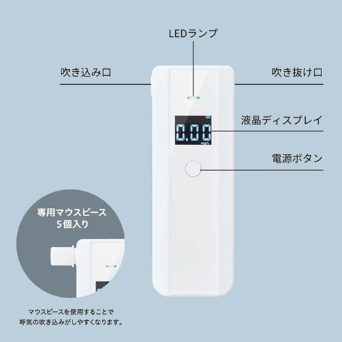 商品仕様 | ●寸法/W約45×D19×H123mm ●重量/約50g ●色/白 ●センサー/半導体ガスセンサー ●センサー寿命/購入後1年経過または1000回使用 ●測定範囲/0.00~1.00mg/L(0.01mg/L単位) ●表示方式/デジタル表示 ●吹込み時間/約5秒 ●電源/単3形アルカリ乾電池×2本(別売) ●付属品/BAC10専用マウスピース×5個(個装)、取扱説明書(保証書付) ●その他仕様/●電池寿命:約1年(1日1回使用した場合) ●使用環境:温度 5~35℃、湿度 30~80%(結露なきこと) ●保存環境:温度 0~50℃、湿度 5~80%(結露なきこと) ●アルコール検知器協議会認定機器 ●備考/※重量は電池含まず。 |