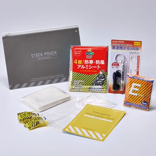 商品仕様 | ●セット内容/防災カード、備蓄氷糖(2個)、ポケットティッシュ、非常用簡易トイレ(汚物収納袋+抗菌性凝固剤)、マスク、ホイッスル、アルミブランケット ●外寸/W約210×D×H148mm ●重量/約140g ●材質/ポーチ:PVC |