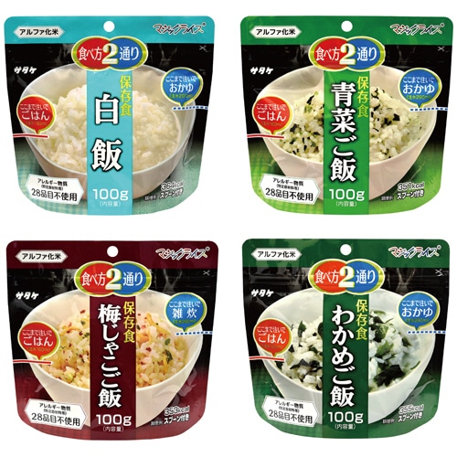 | 商品仕様 | ●内容量/100g ●賞味期限/5年 ●復元方法/お湯または水 ●復元時間/お湯:15分、水:60分 ●カロリー/青菜ご飯:351kcal、梅じゃこご飯:353kcal、白飯:364kcal、わかめご飯:355kcal ●重量/2.5kg ●アレルギー物質不使用/○ ●付属品/スプーン(1食の中に入っています) ●その他仕様/●セット内容:白飯×5袋、梅じゃこご飯×5袋、青菜ご飯×5袋、わかめご飯×5袋 ●外箱サイズ:W210×D340×H170mm ●アレルギー物質28品目不使用 ●備考/※重量は外箱重量。 ※内容量・カロリーは1食あたり ※通常ご納品までに、2~3週間かかる場合がございます。また、需要期や非常時の場合、お届けまでに4週間以上かかる場合がありますことをご了承ください。 ●シリーズ名/マジックライス |