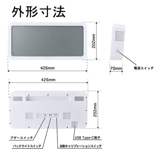商品仕様 | ●寸法/W約426×D70×H202mm ●重量/約1520g ●色/シロ ●材質/ABS、ガラス ●その他仕様/●CO2検出範囲:400~5000ppm ●CO2表示誤差:±(5%+40ppm) ●CO2検出分解能:1ppm ●温度検出範囲:-9~50℃ ●温度表示誤差:±1℃(0~40℃)、±2℃(-9~0℃&40~50℃) ●湿度検出範囲:20~95% ●湿度表示誤差:±5%(40~80%)、±7%(20~40%&80~95%) ●CO2検知方法:光音響方式(光学式) ●補正機能:自動/手動キャリブレーション ●保存環境:温度-10~55℃、湿度5~80% ●電源:USB給電 5V 1A ●付属品:USBケーブル 4m(Type-A/Type-C)、ACアダプタ、取扱説明書(保証書付) |