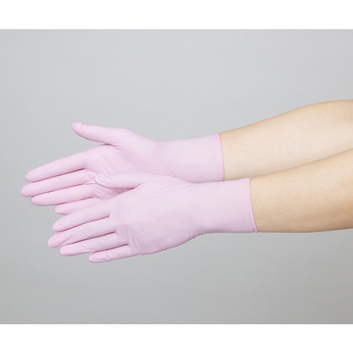 ●伸縮性、耐久性に優れたニトリルゴム素材の手袋。SSサイズのピンク、100枚入です。厚さは指部0.09mm、掌部0.06mm。