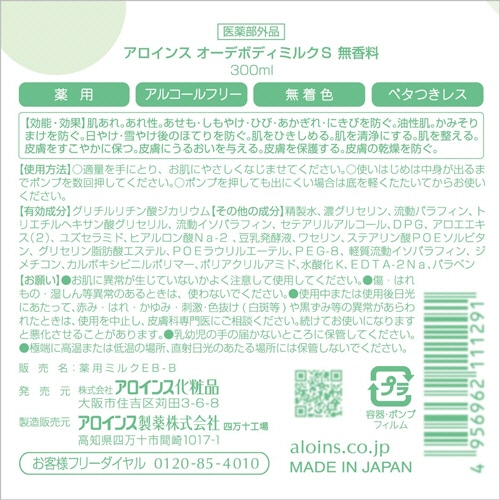 | 商品仕様 | ●種類/ボディミルク ●香り/無香料 ●内容量/300ml ●成分/[有効成分]グリチルリチン酸ジカリウム [その他の成分]精製水、濃グリセリン、流動パラフィン、トリエチルヘキサン酸グリセリル、流動イソパラフィン、セテアリルアルコール、DPG、アロエエキス(2)、ユズセラミド、ヒアルロン酸Na-2、豆乳発酵液、ワセリン、ステアリン酸POEソルビタン、グリセリン脂肪酸エステル、POEラウリルエーテル、PEG-8、軽質流動イソパラフィン、ジメチコン、カルボキシビニルポリマー、ポリアクリルアミド、水酸化K、EDTA-2Na、パラベン ●その他仕様/●効能・効果:肌あれ、あれ性、あせも・しもやけ・ひび・あかぎれ・にきびを防ぐ、油性肌、かみそりまけを防ぐ、日やけ・雪やけ後のほてりを防ぐ、肌をひきしめる、肌を清浄にする、肌を整える、皮膚をすこやかに保つ、皮膚にうるおいを与える、皮膚を保護する、皮膚の乾燥を防ぐ ●備考/※販売名:薬用ミルクEB-B |