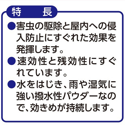 | 商品仕様 | ●タイプ/粉剤 ●対象害虫/ムカデ、ヤスデ、ゲジゲジ、ケムシ、ダンゴムシ、ワラジムシ、クロアリ、アカアリ、アカカミアリ、アルゼンチンアリ、ヒアリ、シロアリ、アリガタバチ、クモ、カメムシ、シバンムシ ●内容量/1kg ●シリーズ名/虫コロリアース |