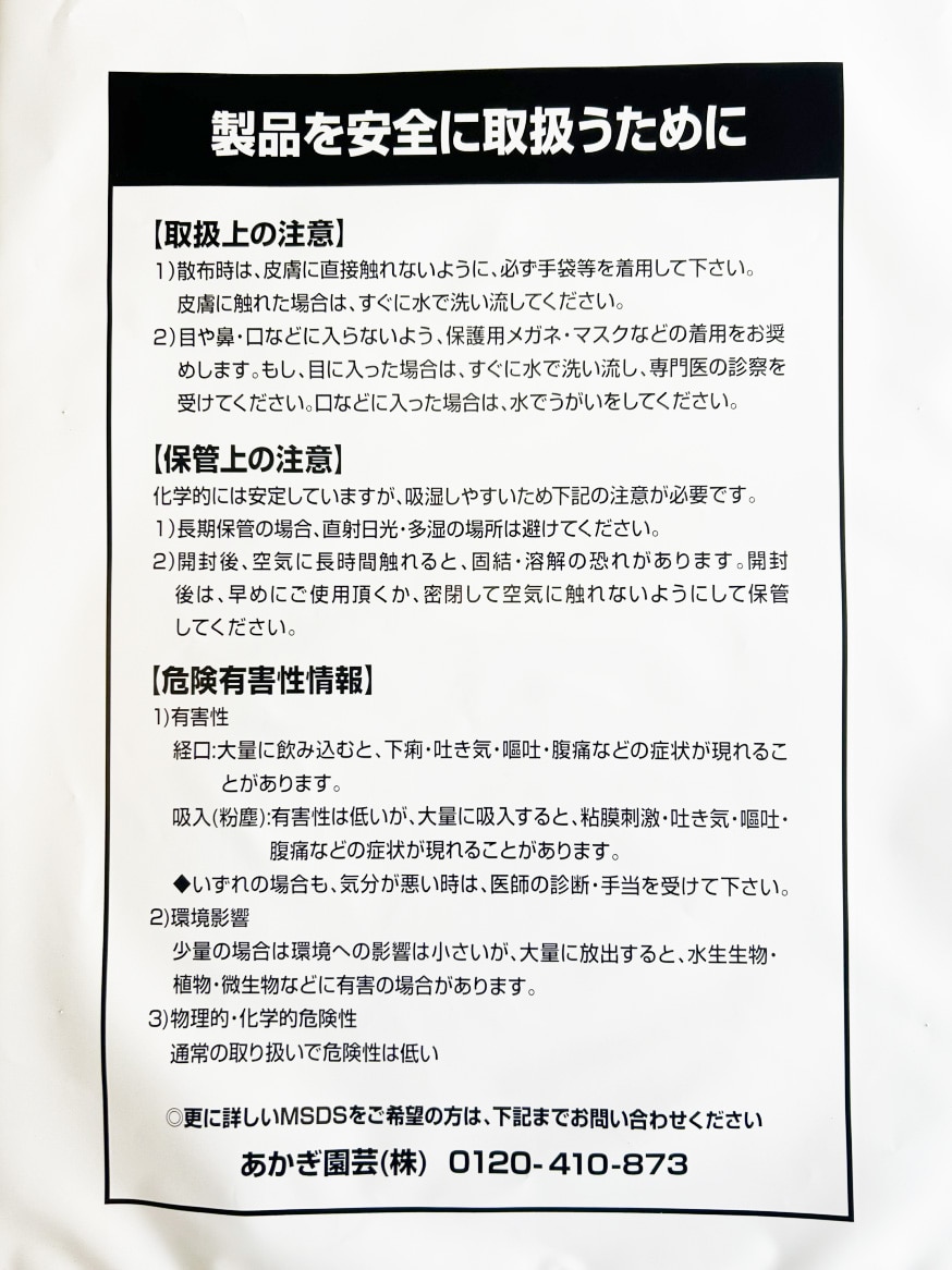 ●塩化カルシウムは、吸湿性・潮解性が非常に強く、水溶液は0℃以下でも凍らないため、融氷雪剤・防塵剤として広く使われています。雪消一番5kg