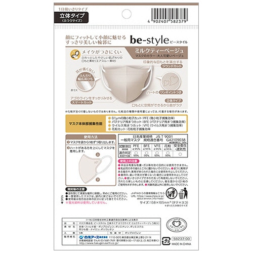 | 商品仕様 | ●マスク形状/立体型 ●サイズ/ふつう ●寸法/138×105mm ●色/ミルクティーベージュ ●BFE/≧95% ●PFE/≧95% ●材質/本体・フィルタ部:ポリプロピレン・ポリエチレン・ポリエステル、耳ひも部:ナイロン・ポリウレタン ●生産国/中国 ●その他仕様/●VFE:≧95% ●JIS T 9001 一般用マスク ●備考/※寸法は折りたたみ時 ※化粧が全く付着しないものではありません。化粧品の種類や使用量によっては、付着する場合があります。 ※蛍光染料は使用していません。 ※マスクは感染(侵入)を完全に防ぐものではありません。 ●シリーズ名/be-style(ビースタイル) |
