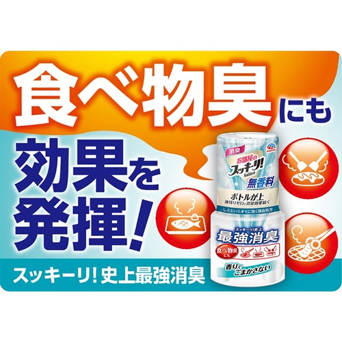 | 商品仕様 | ●香り/無香料 ●内容量/400ml ●使用推奨空間/室内 ●持続時間/1.5~3ヵ月 ●成分/非イオン界面活性剤、有機窒素系消臭剤、植物抽出物(植物系消臭剤)、イオン系消臭剤、強力デオドライズパウダー(無機系消臭剤) ●その他仕様/●生産国:日本 ●備考/※持続時間は温度や使用環境により変動します。 ●シリーズ名/Sukki-ri!(スッキーリ!) |