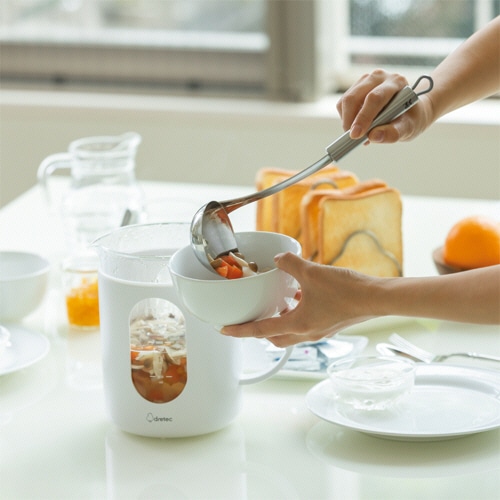 | 商品仕様 | ●寸法/W215×D205×H240mm ●質量/約1.4kg ●色/ホワイト ●材質/本体:ステンレス・ポリプロピレン・耐熱ガラス、給電スタンド:ポリプロピレン、茶こし:ステンレス ●その他仕様/●電源:AC100V 50/60Hz共用 ●定格消費電力:800W ●最大容量:水のみ1.5L、調理1.2L(食材含む) ●電源コード長さ:約120cm ●設定温度:45~95℃までの5℃刻み、沸騰 ●保温時間:1~180分 ●付属品:茶こし、レシピブック ●保証期間:1年 ●備考/※重量は給電スタンドを含む |