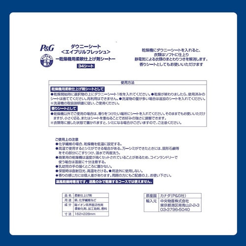 ●乾燥機用柔軟仕上げ剤シート。春の太陽のようなエイプリルフレッシュの香り、34枚入です。