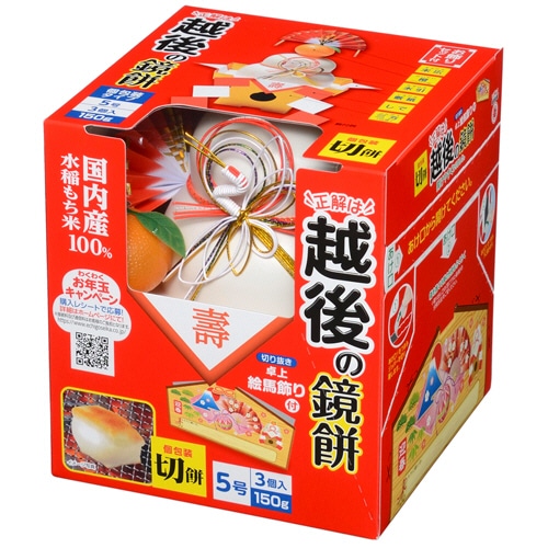 | 商品仕様 | ●種類/鏡餅 ●形状/切餅 ●内容量/150g ●カロリー/229kcal ●栄養成分/たんぱく質:4.5g、脂質:0.5g、炭水化物:51.7g、食塩相当量:0.0g ●原材料/水稲もち米(国内産) ●賞味期限/商品の発送時点で、賞味期限まで残り120日以上の商品をお届けします。 ●製造国/日本 ●原産国/日本 ●保存方法/直射日光、高温・多湿の場所での保存は避けてください。 ●その他仕様/●化粧箱サイズ:140×140×170mm ●付属品:末広・橙・水引・敷紙・しで・三方 ●備考/※カロリー・栄養成分は100gあたり ※メーカー都合により、パッケージデザインおよび仕様が変更になる場合がございます。 |