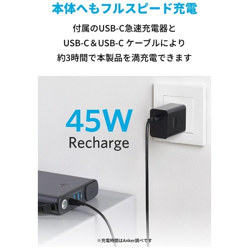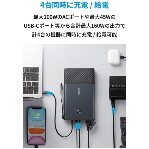 | 商品仕様 | ●種類/ポータブル電源 ●充電池容量/24000mAh/87.6Wh ●寸法/W約201×D120×H31mm ●重量/845g ●色/ブラック ●AC出力電圧/電流/AC 100W(瞬間最大125W) ●USB出力電圧/電流/USB-A(各ポート最大12W/合計最大15W)、USB-C(最大45W)、4ポート合計最大出力 160W ●付属品/USB-C & USB-Cケーブル、USB-C & USB-Aケーブル、USB急速充電器、携帯用ストラップ ●保証期間/18ヵ月+6ヵ月(Anker会員登録後) ●その他仕様/●スマホ充電:約10回 ●LED照明:約16時間 ●PD45W ●備考/※「スマホ充電・LED照明」使用時間・回数について:スマートフォン2000mAh、照明4.2Wを想定。使用可能時間や充電回数は、製品仕様の容量から算出した、あくまで数値上の大まかな目安であり、実際の数値と異なる場合があります。 |