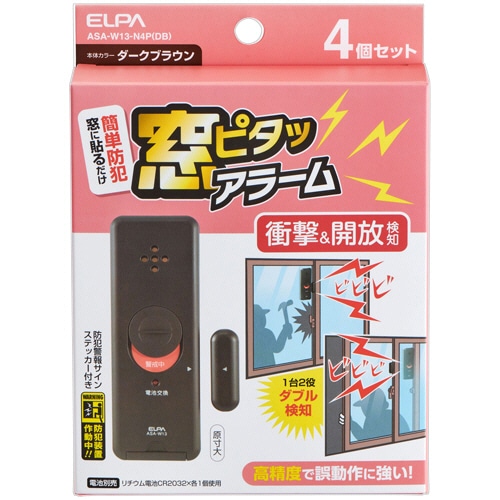 ELPA 窓ピタッアラーム 衝撃+開放検知式(ダブル検知タイプ) ダークブラウン ASA-W13-N4P(DB) 1ケース(4個)