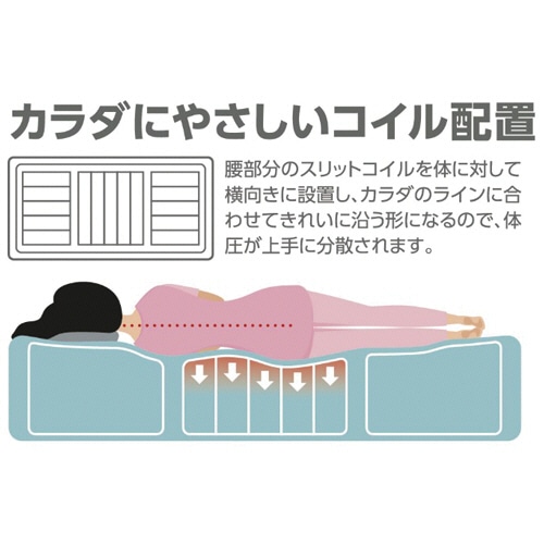 ●カラダにやさしいコイル配置:腰部分のスリットコイルを体に対して横向きに設置し、カラダのラインに合わせてきれいに沿う形になるので、体圧が上手に分散されます。