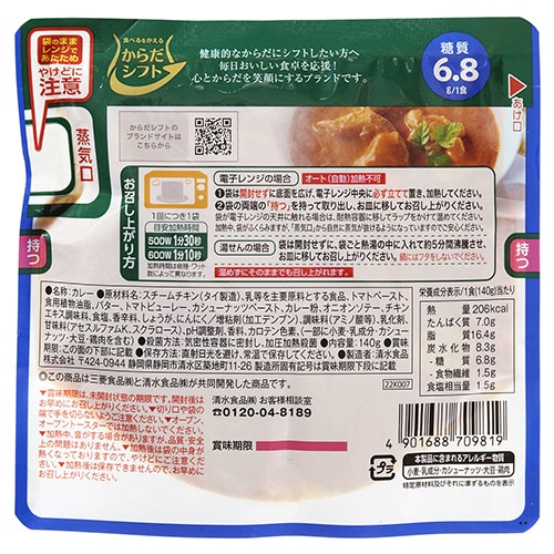 | 商品仕様 | ●味/バターチキンカレー ●内容量/140g ●カロリー/206kcal ●栄養成分/たんぱく質:7.0g、脂質:16.4g、炭水化物:8.3g(糖質:6.8g、食物繊維:1.5g)、食塩相当量:1.5g ●賞味期限/商品の発送時点で、賞味期限まで残り40日以上の商品をお届けします。 ●表示すべきアレルギー項目/小麦、乳成分、カシューナッツ、大豆、鶏肉 ●原材料/[原材料]スチームチキン(タイ製造)、乳等を主要原料とする食品、トマトペースト、食用植物油脂、バター、トマトピューレー、カシューナッツペースト、カレー粉、オニオンソテー、チキンエキス調味料、食塩、香辛料、しょうが、にんにく [添加物]増粘剤(加工デンプン)、調味料(アミノ酸等)、乳化剤、甘味料(アセスルファムK、スクラロース)、pH調整剤、香料、カロテン色素、(一部に小麦・乳成分・カシューナッツ・大豆・鶏肉含む) ●製造国/日本 ●保存方法/直射日光を避け、常温で保存してください。 ●備考/※メーカー都合により、パッケージデザインおよび仕様が変更になる場合がございます。 ●シリーズ名/からだシフト |