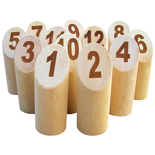 ●道具:[モルック]投げる棒をモルックと呼びます。おおよそ長さ22.5cm、直径5.9cm。[スキットル]1 ~ 12までの数字が記載されている12本のスキットル、 おおよそ高さ15cm、直径5.9cmであり、45°に面取りされています。