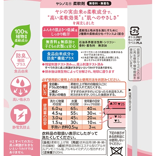 商品仕様 | ●タイプ/本体 ●柔軟剤の種類/液体 ●香り/無香料 ●内容量/520ml ●シリーズ名/ヤシノミ |