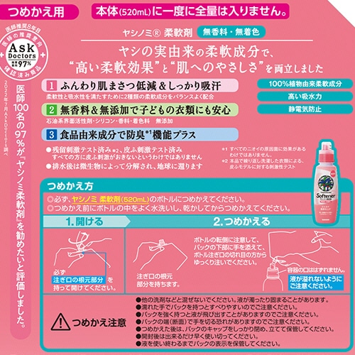 | 商品仕様 | ●タイプ/詰替 ●柔軟剤の種類/液体 ●香り/無香料 ●内容量/1050ml ●シリーズ名/ヤシノミ |