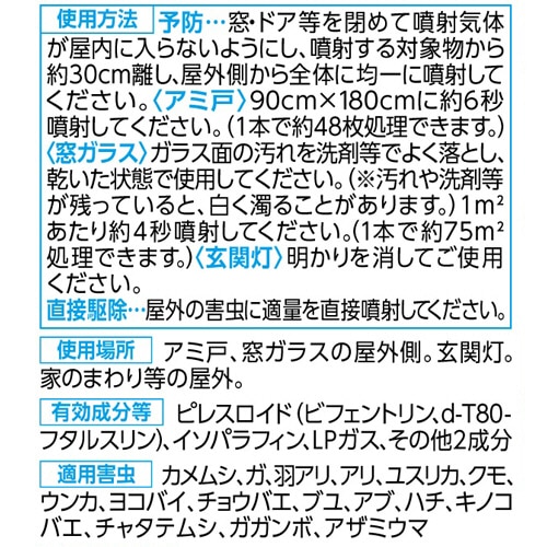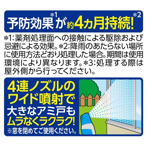 ●4連ノズルのワイド噴射により付着率がアップしました。大きなアミ戸や窓ガラスもムラなく簡単にスプレー。1本でアミ戸(90×180cm)を約48枚処理できます。(※窓を閉めてご使用ください。)