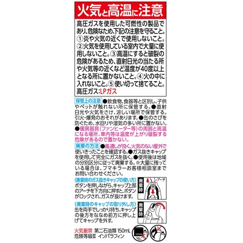 商品仕様 | ●タイプ/スプレータイプ ●効果/予防、駆除 ●対象害虫/カメムシ、ガ、羽アリ、アリ、ユスリカ、クモ、ウンカ、ヨコバイ、チョウバエ、ブユ、アブ、ハチ、キノコバエ、チャタテムシ、ガガンボ、アザミウマ ●用途/屋外用(アミ戸・窓ガラスの屋外側、玄関灯、家のまわり等の屋外) ●使用可能日数/予防効果4ヵ月 ●内容量/450ml ●有効成分/ピレスロイド(ビフェントリン、d-T80-フタルスリン)、イソパラフィン、LPガス、その他2成分 |