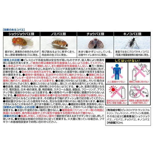 商品仕様 | ●タイプ/スプレータイプ ●効果/予防、駆除 ●対象害虫/ショウジョウバエ類、ノミバエ類、チョウバエ類、キノコバエ類 ●用途/キッチン回り、ゴミ箱、三角コーナー、排水口まわりなど ●使用可能日数/1ヵ月 ●内容量/92ml ●香り/無香料 ●有効成分/ピレスロイド(トランスフルトリン、フェノトリン)、パラフィン系溶剤、その他2成分 ●その他仕様/●80回分 |