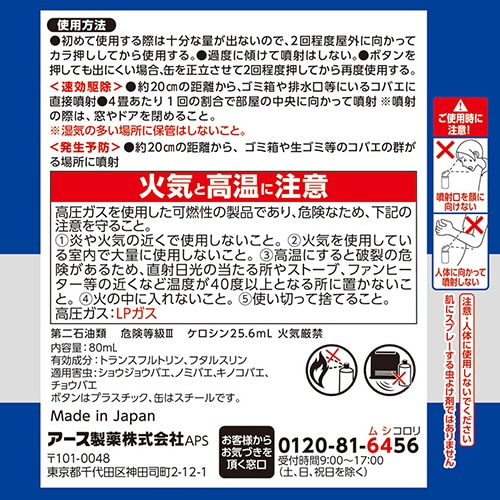 商品仕様 | ●タイプ/スプレータイプ ●効果/駆除、発生予防 ●対象害虫/ショウジョウバエ、ノミバエ、キノコバエ、チョウバエ ●使用可能日数/発生予防4週間 ●内容量/80ml ●香り/無香料 ●有効成分/トランスフルトリン、フタルスリン ●その他仕様/●60回分 ●備考/※使用可能日数は使用環境により異なります。 |
