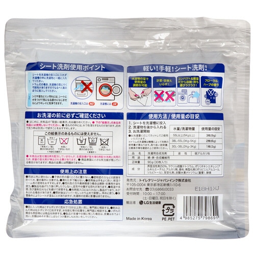 商品仕様 | ●洗剤の種類/シート ●用途/綿・麻・合成繊維用 ●香り/フローラルハーブの香り ●内容量/90g ●標準使用量/水30~38Lに対して1枚(3g) ●液性/弱アルカリ性 ●成分/界面活性剤(50%、ラウリル硫酸ナトリウム、ポリ(オキシエチレン)アルキルエーテル)、アルカリ剤、香料、剤型化剤(ポリビニルアルコール、ソルビトール)、安定化剤、炭酸水素ナトリウム(重曹)、酵素 ●その他仕様/●生産国:韓国 |