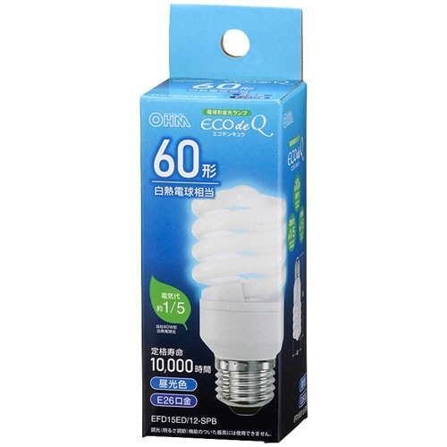 オーム電機 電球形蛍光灯 エコデンキュウ スパイラル形 60形 E26 昼光色 EFD15ED/12-SPB 1個