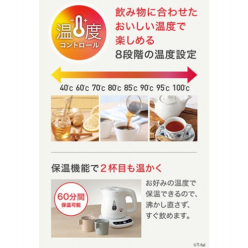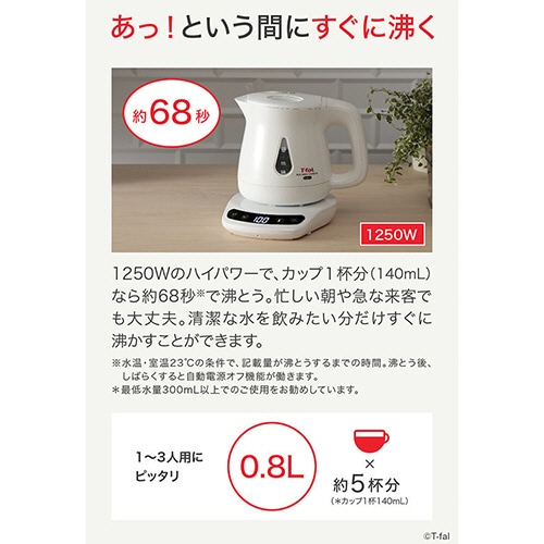 | 商品仕様 | ●容量/0.8L ●色/白 ●沸騰目安時間/カップ1杯:約1分10秒、満水:約4分23秒 ●消費電力/1250W ●保温設定(最大)/あり(60分:40・60・70・80・85・90・95・100℃) ●寸法/W170×D220×H210mm ●質量/約1270g ●その他仕様/●タッチパネル式電源プレート ●保証期間/1年 ●備考/※重量は電源プレート含む。 ●シリーズ名/T-fal |