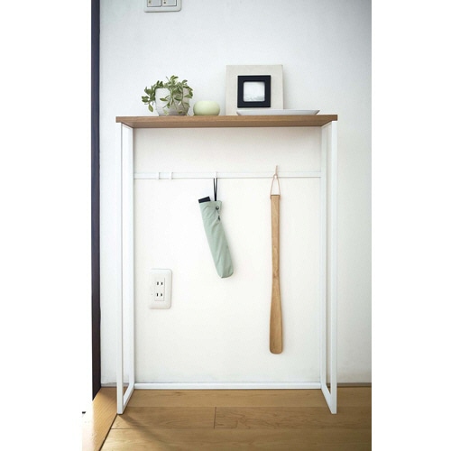 商品仕様 | ●タイプ/コンソールテーブル ●外寸/W600×D185×H805mm ●重量/約3.4kg ●色/ホワイト ●材質/本体:スチール(粉体塗装)、天板:天然木化粧繊維板(ラッカー塗装) ●必要工具/プラスドライバー ●付属品/フック×4個 ●その他仕様/●内寸:W570×D165×H785mm ●天板厚み:約15mm ●耐荷重:天板/約5kg、バー/約1kg、フック(1つあたり)/約250g ●備考/※屋外でのご使用はできません。 |
