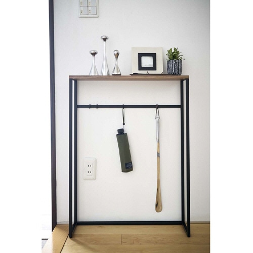 商品仕様 | ●タイプ/コンソールテーブル ●外寸/W600×D185×H805mm ●重量/約3.4kg ●色/ブラック ●材質/本体:スチール(粉体塗装)、天板:天然木化粧繊維板(ラッカー塗装) ●必要工具/プラスドライバー ●付属品/フック×4個 ●その他仕様/●内寸:W570×D165×H785mm ●天板厚み:約15mm ●耐荷重:天板/約5kg、バー/約1kg、フック(1つあたり)/約250g ●備考/※屋外でのご使用はできません。 |