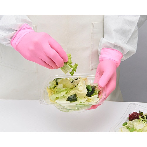 【食品衛生法適合】ピンクカラーで作業性と強度のバランスに優れた汎用性の高いタイプの使い捨てニトリルゴム手袋(パウダーフリー)