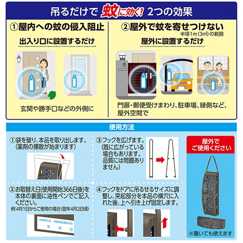 吊るだけで、屋内への侵入阻止+屋外で寄せつけない効果。簡単・手軽に蚊対策!