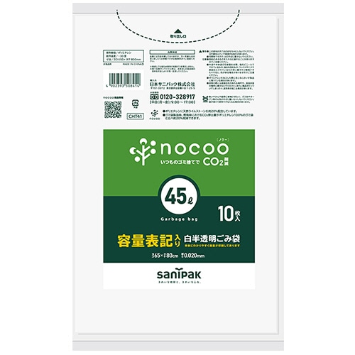 日本サニパック nocoo 容量表記ごみ袋 白半透明 45L 0.020mm CHT41 1パック(10枚)
