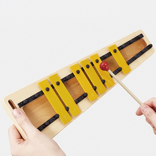 手にもって演奏ができる小さなグロッケン。音板を外して音あそびや即興演奏に。