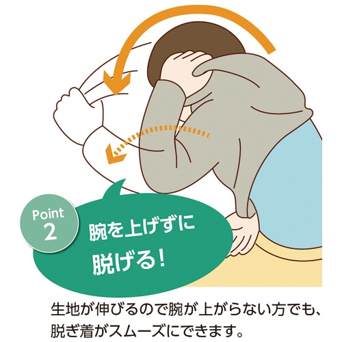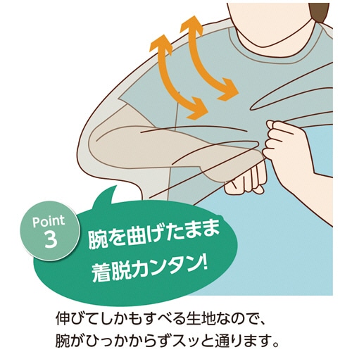 ●生地が伸びるので腕が上がらない方でも、脱ぎ着がスムーズにできます。