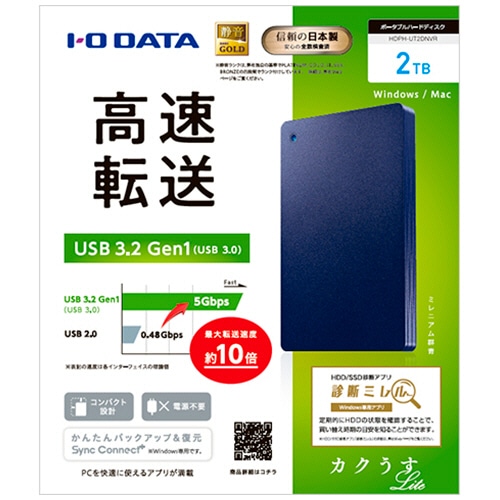アイオーデータ USB 3.2 Gen1/2.0対応 ポータブルハードディスク「カクうすLite」 2TB ミレニアム群青 HDPH-UT2DNVR 1台