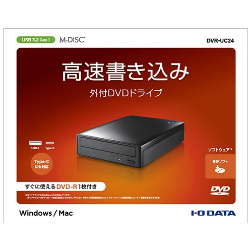 ●「DVR-UC24」は、最大24倍速の高速書き込みに対応したType-C/USB A 搭載のパソコン対応外付型DVDドライブです。