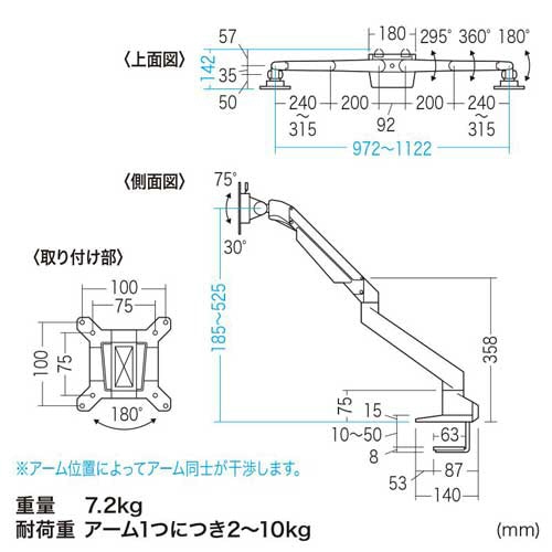 商品仕様 | ●重量/6.8kg ●その他仕様/●色:ブラック ●材質:[クランプ]アルミ・スチール、[アーム]アルミ ●可動範囲:画面回転(ローテーション)/180°、左右(スウィング)/360°、画面左右(パン)/180°、画面上下(チルト)/105° ●耐荷重:アーム1につき2~10kg ●付属品:ディスプレイ取付けネジ(M4×14・8本) |