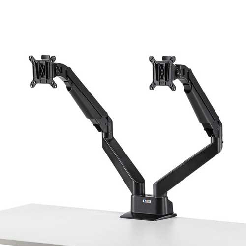 ●クランプ式、グロメット式の取り付け方法が選べる、左右2面タイプのモニターアーム、カラーはブラックです。