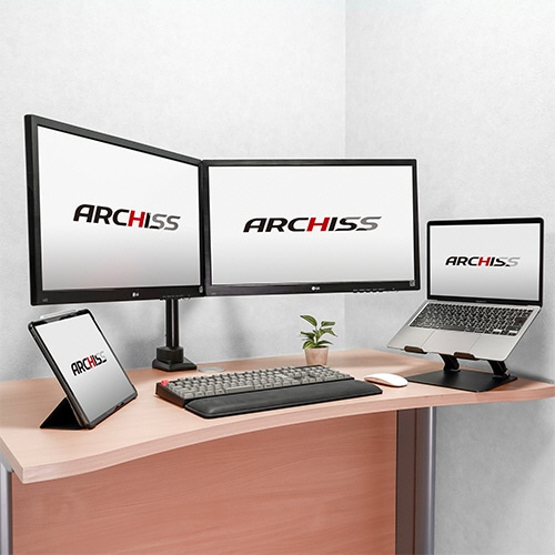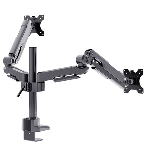 デュアルモニター用アーム。前後・左右・上下あらゆる方向に対応。分離式で稼働がスムーズ。
