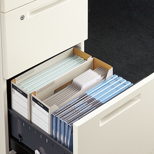 ●机の引き出しなどに横収納しても、本体の重みで表紙が曲がることなく、すっきりと収容できます。