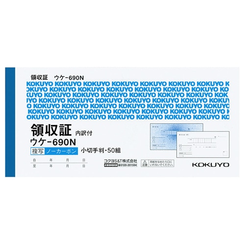 コクヨ 領収証(ノーカーボン複写) 小切手判・ヨコ型 ヨコ書 二色刷り(位線付き) 50組 ウケ-690 1セット(5冊)