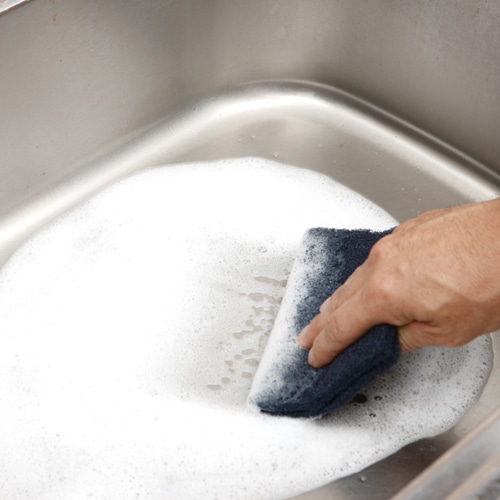 キズをつけにくい樹脂研磨粒子を含んだ不織布たわし。