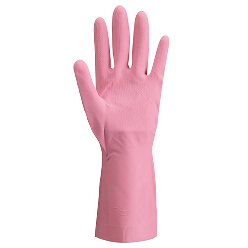 商品仕様 | ●サイズ/S ●寸法/全長300×手のひら周り192×中指長さ70mm ●色/ピンク ●材質/表:天然ゴム、裏:綿(植毛) ●その他仕様/●中厚手 |