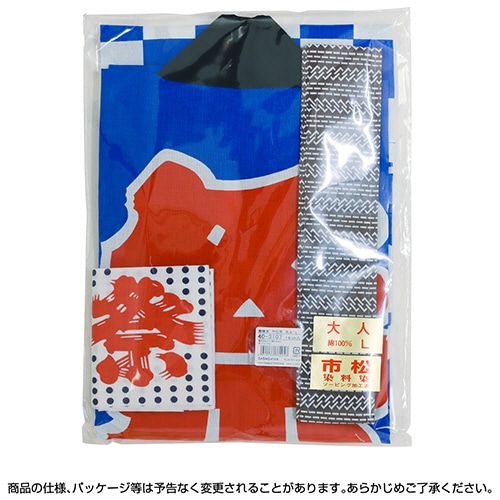 | 商品仕様 | ●色/青 ●材質/綿100%(天竺) ●その他仕様/●大人用 ●サイズ:L ●寸法:縦800×横650mm、袖/縦300×横330mm、手拭/長さ330×幅900mm、帯/幅70×長さ1600mm ●帯・手拭付 ●備考/※季節用品のため、数に限りがございます。あらかじめご了承ください。 |