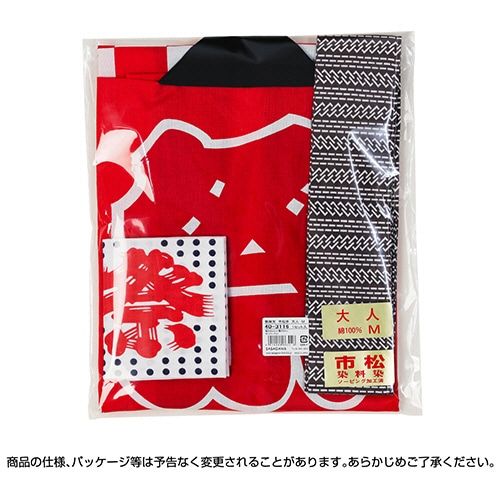 | 商品仕様 | ●色/赤 ●材質/綿100%(天竺) ●その他仕様/●大人用 ●サイズ:M ●寸法:縦690×横600mm、袖/縦280×横260mm、手拭/長さ330×幅900mm、帯/幅70×長さ1600mm ●帯・手拭付 ●備考/※季節用品のため、数に限りがございます。あらかじめご了承ください。 |