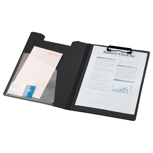 書類が見えない二つ折カバー付。軽くて丈夫な二つ折クリップファイル。